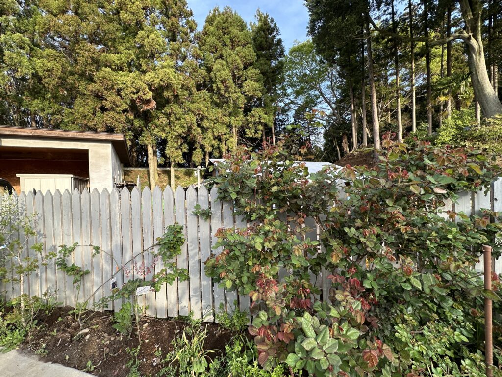 この後、赤いつるバラが咲いてくる